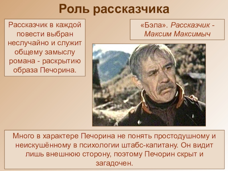 Много в характере Печорина не понять простодушному и неискушённому в психологии штабс-капитану. Он видит лишь внешнюю сторону, поэтому Печорин скрыт и загадочен.