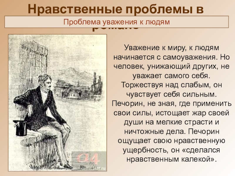 Но человек, унижающий других, не уважает самого себя. Торжествуя над слабым, он чувствует себя сильным. Печорин, не зная, где применить свои силы, истощает жар своей души на мелкие страсти и ничтожные дела. Печорин ощущает свою нравственную ущербность, он «сделался нравственным калекой».