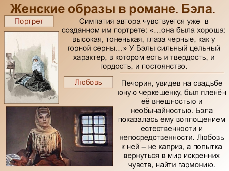 портрете: «…она была хороша: высокая, тоненькая, глаза черные, как у горной серны…» У Бэлы сильный цельный характер, в котором есть и твердость, и гордость, и постоянство.
