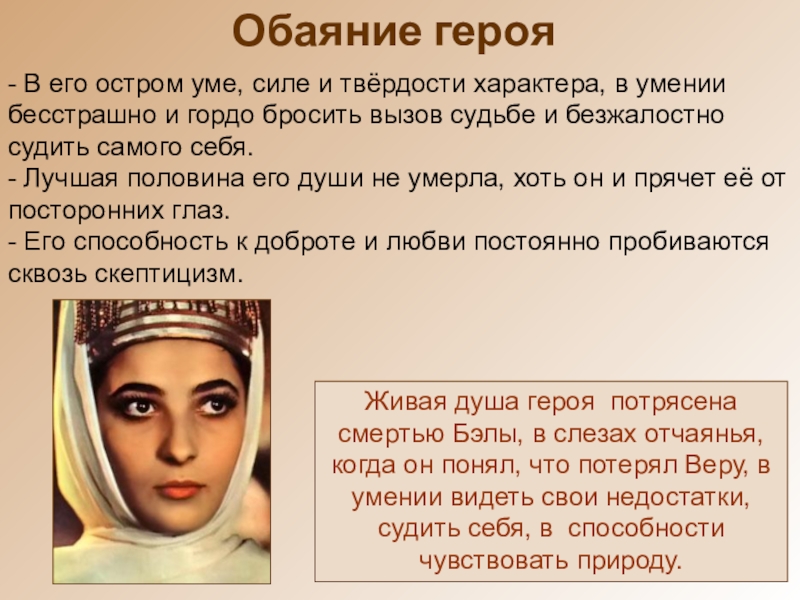 Живая душа героя потрясена смертью Бэлы, в слезах отчаянья, когда он понял, что потерял Веру, в умении видеть свои недостатки, судить себя, в способности чувствовать природу.