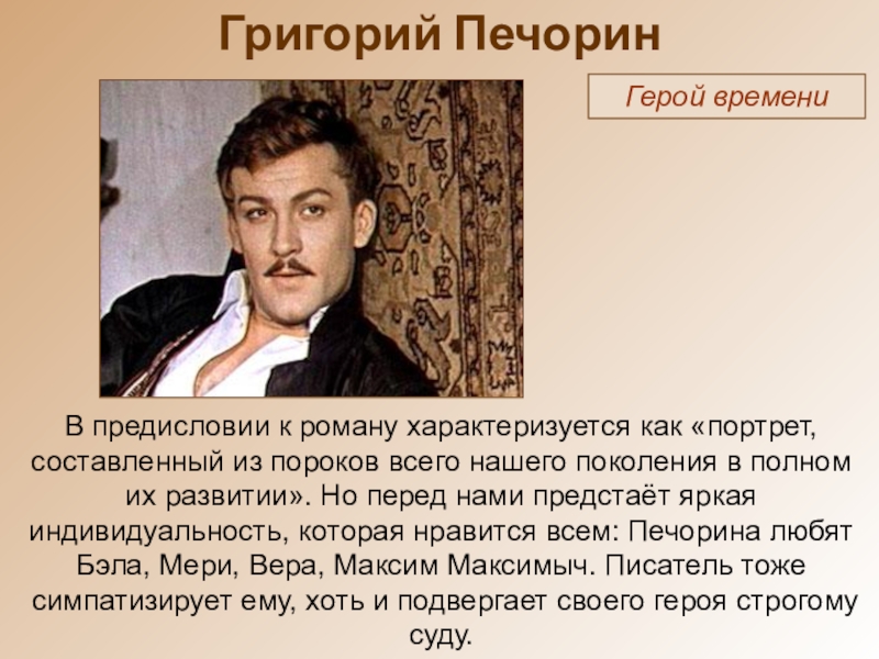 пороков всего нашего поколения в полном их развитии». Но перед нами предстаёт яркая индивидуальность, которая нравится всем: Печорина любят Бэла, Мери, Вера, Максим Максимыч. Писатель тоже симпатизирует ему, хоть и подвергает своего героя строгому суду.