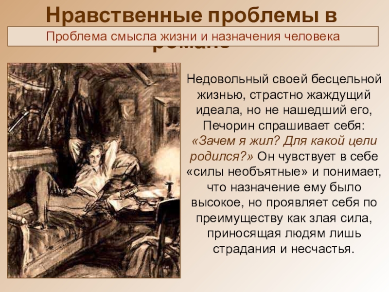 не нашедший его, Печорин спрашивает себя: «Зачем я жил? Для какой цели родился?» Он чувствует в себе «силы необъятные» и понимает, что назначение ему было высокое, но проявляет себя по преимуществу как злая сила, приносящая людям лишь страдания и несчастья.
