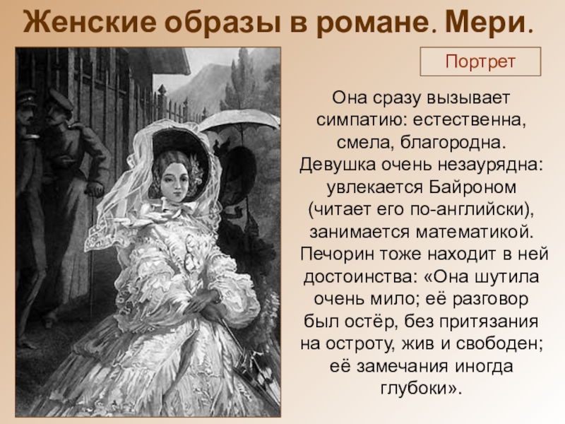 Девушка очень незаурядна: увлекается Байроном (читает его по-английски), занимается математикой. Печорин тоже находит в ней достоинства: «Она шутила очень мило; её разговор был остёр, без притязания на остроту, жив и свободен; её замечания иногда глубоки».