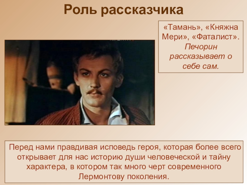 «Тамань», «Княжна Мери», «Фаталист». Печорин рассказывает о себе сам.
