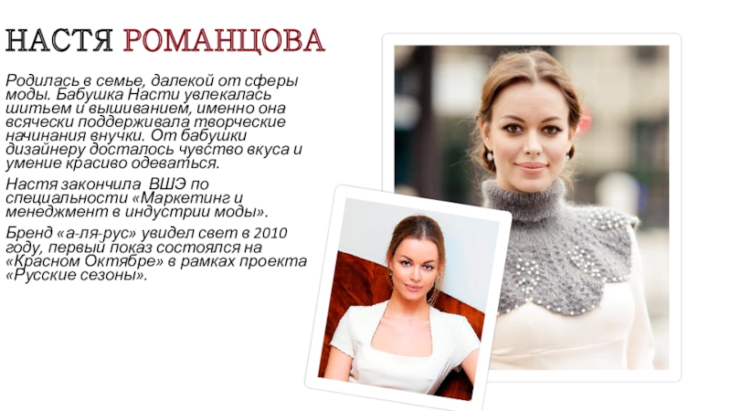 НАСТЯ РОМАНЦОВАРодилась в семье, далекой от сферы моды. Бабушка Насти увлекалась шитьем и вышиванием, именно она всячески