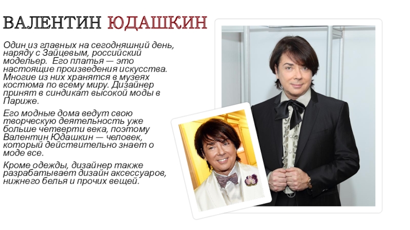 ВАЛЕНТИН ЮДАШКИНОдин из главных на сегодняшний день, наряду с Зайцевым, российский модельер. Его платья — это настоящие
