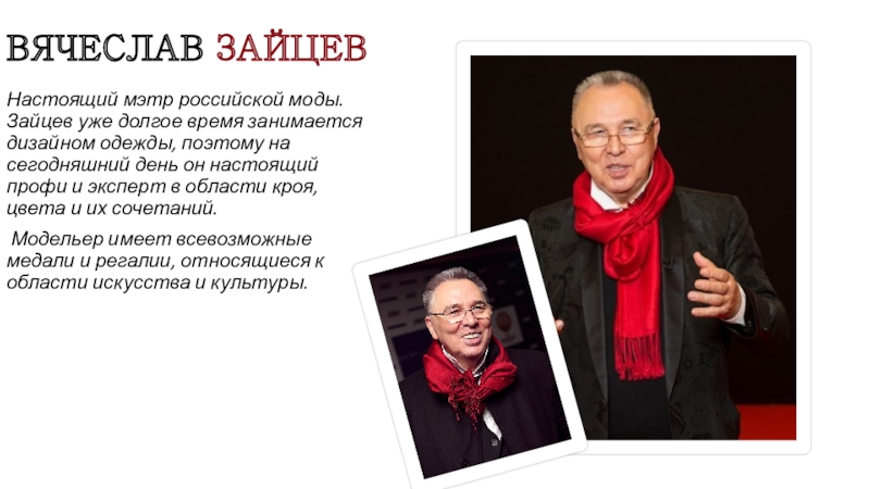 ВЯЧЕСЛАВ ЗАЙЦЕВНастоящий мэтр российской моды. Зайцев уже долгое время занимается дизайном одежды, поэтому на сегодняшний день он настоящий профи и эксперт в области кроя, цвета и их сочетаний. Модельер имеет всевозможные медали и регалии, относящиеся к