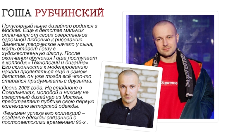 ГОША РУБЧИНСКИЙПопулярный ныне дизайнер родился в Москве. Еще в детстве мальчик отличался от своих сверстников огромной любовью