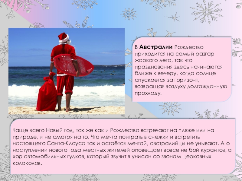 В Австралии Рождество приходится на самый разгар жаркого лета, так что празднования здесь начинаются ближе к вечеру, когда солнце спускается за горизонт, возвращая воздуху долгожданную прохладу.