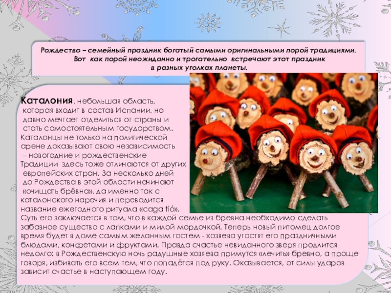 Суть его заключается в том, что в каждой семье из бревна необходимо сделать забавное существо с лапками и милой мордочкой. Теперь новый питомец долгое время будет в доме самым желанным гостем - хозяева угостят его праздничными блюдами, конфетами и фруктами. Правда счастье невиданного зверя продлится недолго: в Рождественскую ночь радушные хозяева примутся «лечить» бревно, а проще говоря, избивать его всем тем, что попадётся под руку. Оказывается, от силы ударов зависит счастье в наступающем году.