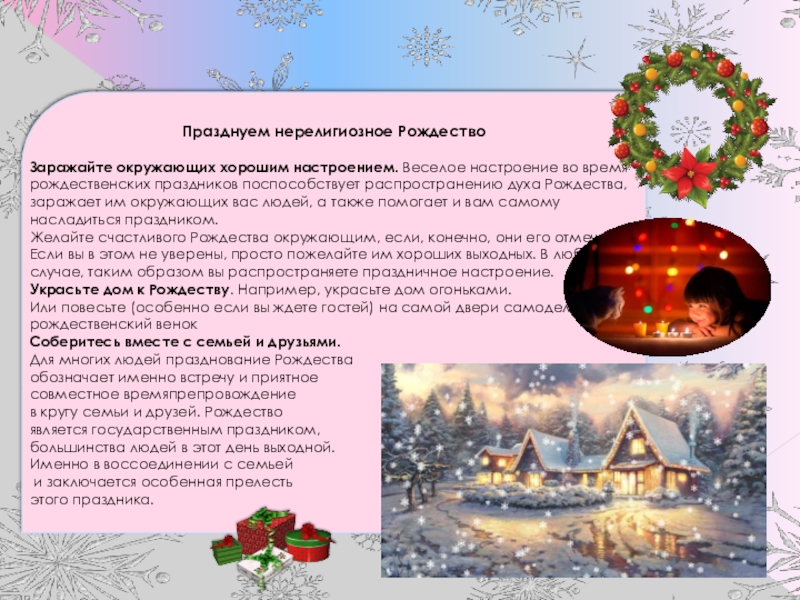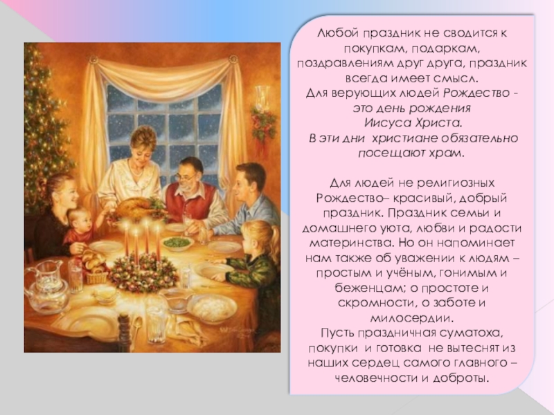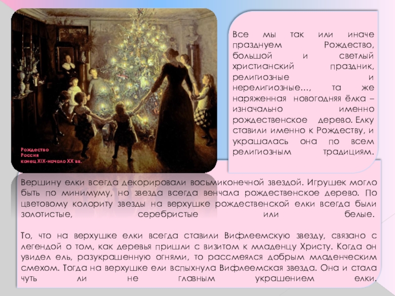 Все мы так или иначе празднуем Рождество, большой и светлый христианский праздник, религиозные и нерелигиозные…, та же наряженная новогодняя ёлка – изначально именно рождественское дерево. Елку ставили именно к Рождеству, и украшалась она по всем религиозным традициям.