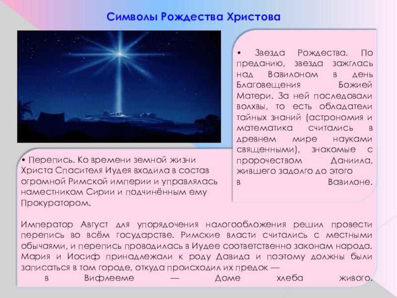 • Звезда Рождества. По преданию, звезда зажглась над Вавилоном в день Благовещения Божией Матери. За ней последовали волхвы, то есть обладатели тайных знаний (астрономия и математика считались в древнем мире науками священными), знакомые с пророчеством Даниила, жившего задолго до этого