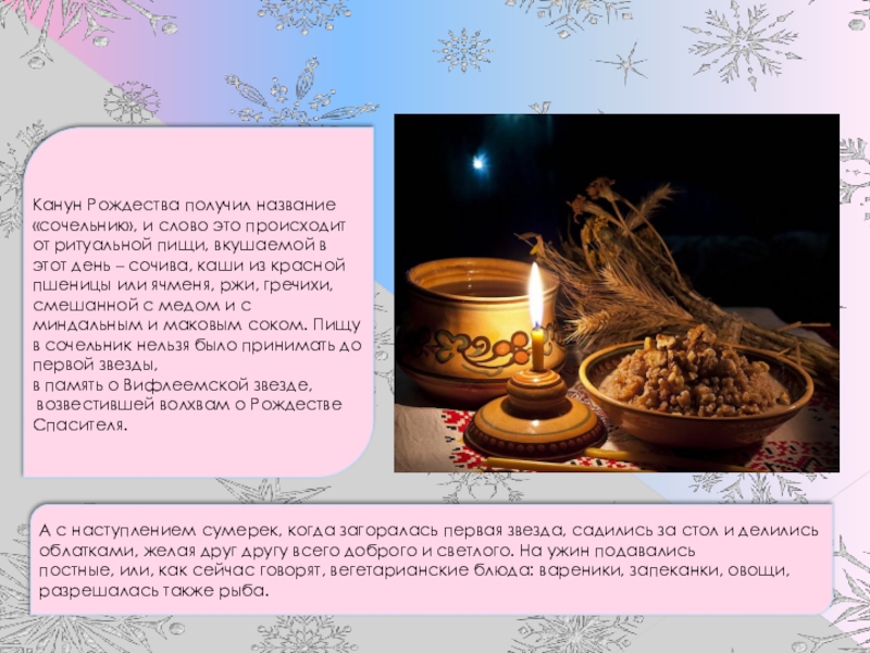 А с наступлением сумерек, когда загоралась первая звезда, садились за стол и делились облатками, желая друг другу всего доброго и светлого. На ужин подавались
