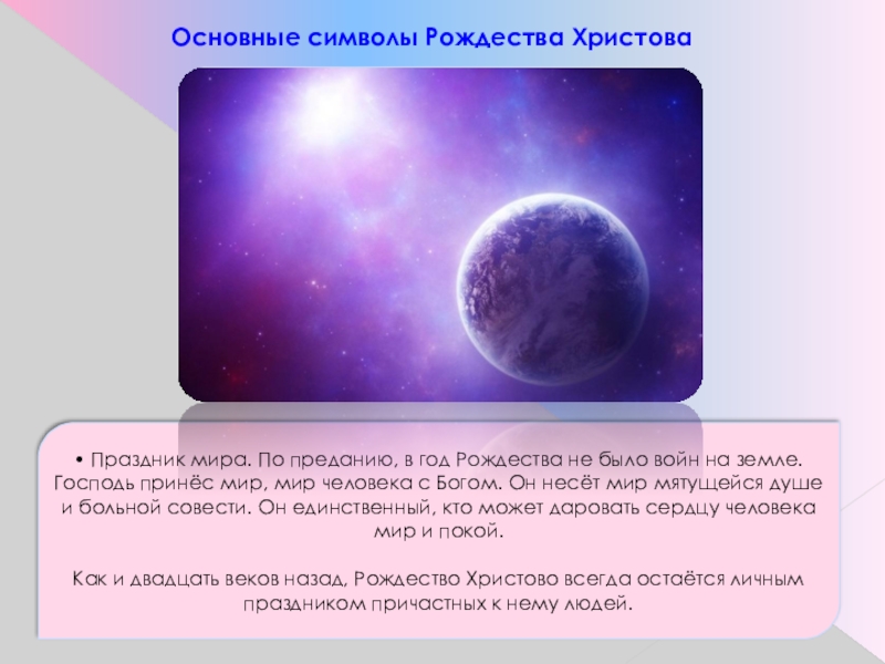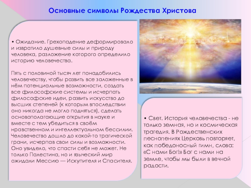 • Свет. История человечества - не только земная, но и космическая трагедия. В Рождественских песнопениях Церковь повторяет, как победоносный гимн, слова: