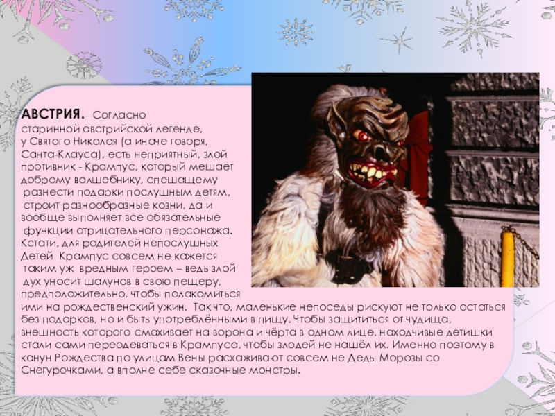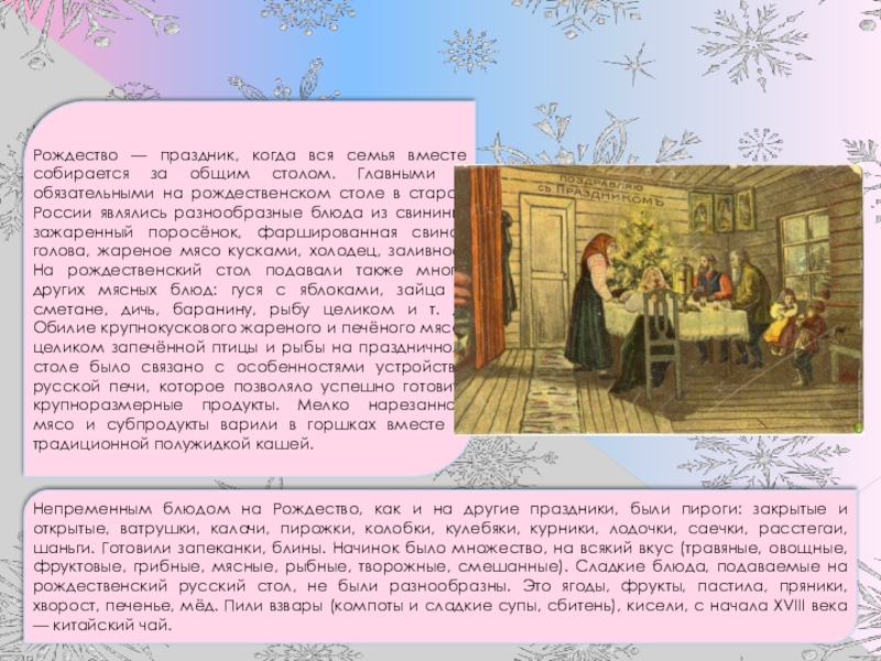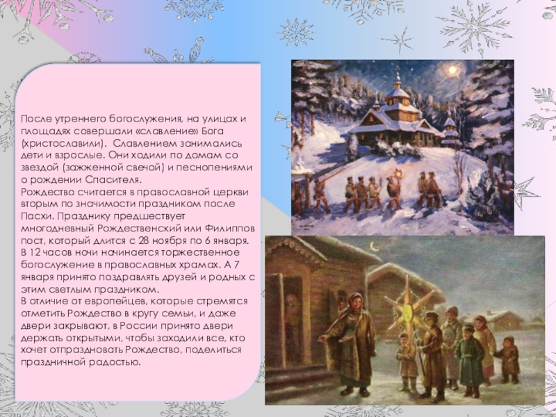 С Рождества начинаются Святки – сплошные праздники, которые длятся до Крещенского Сочельника и сопровождаются гуляньями, посещением родных и друзей, маскарадами.