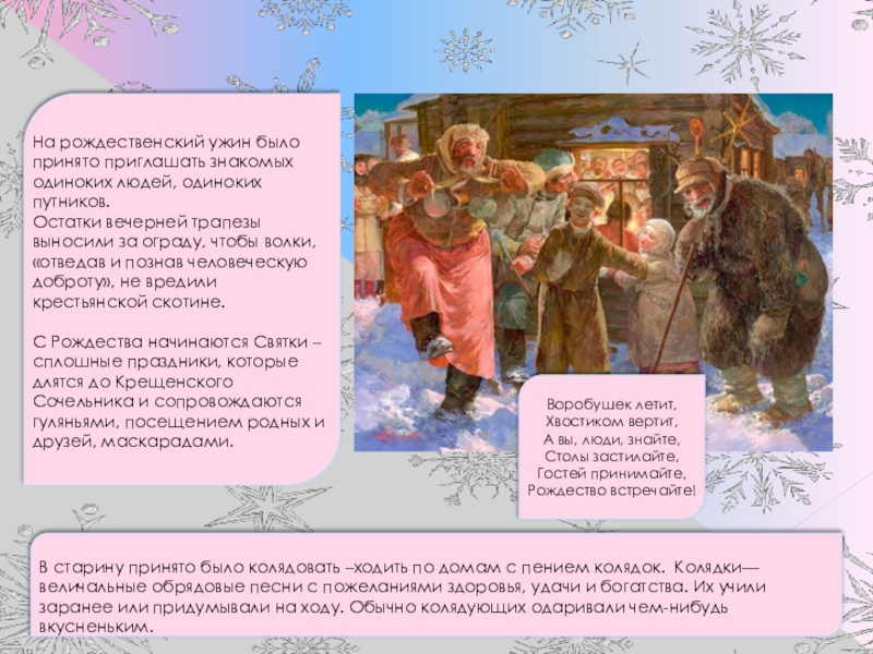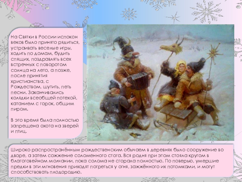 На Святки в России испокон веков было принято рядиться, устраивать веселые игры, ходить по домам, будить спящих, поздравлять всех встречных с поворотом солнца на лето, а позже, после принятия христианства, с Рождеством, шутить, петь песни. Заканчивались колядки всеобщей потехой, катанием с горок, общим пиром.