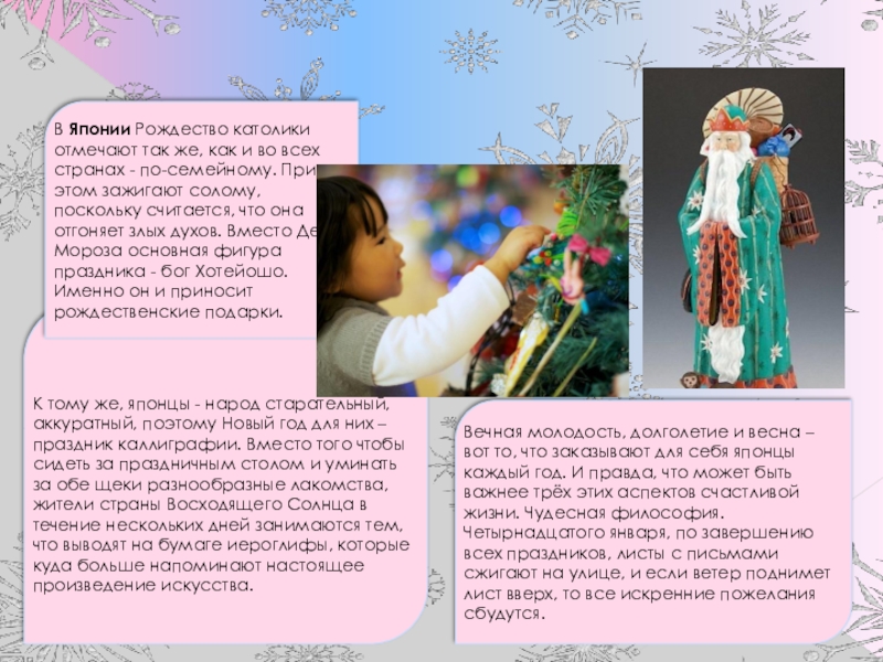 Вечная молодость, долголетие и весна – вот то, что заказывают для себя японцы каждый год. И правда, что может быть важнее трёх этих аспектов счастливой жизни. Чудесная философия.