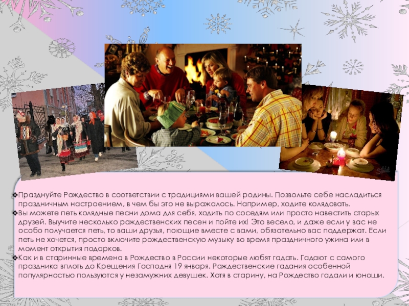 Сейчас Рождество в России празднуют с 6 на 7 января. Ночью в церквях идет праздничная служба. В эти дни православные христиане обязательно посещают храм. Это главное.