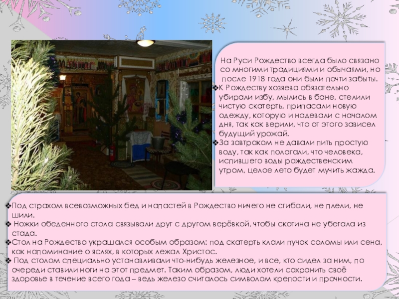 К Рождеству хозяева обязательно убирали избу, мылись в бане, стелили чистую скатерть, припасали новую одежду, которую и надевали с началом дня, так как верили, что от этого зависел будущий урожай.