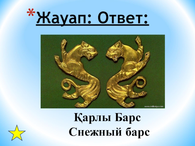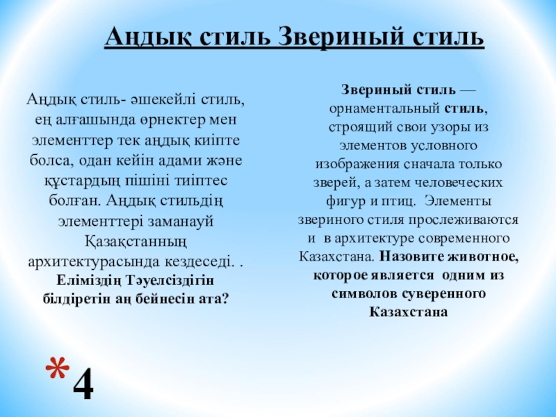Звериный стиль — орнаментальный стиль, строящий свои узоры из элементов условного изображения сначала только зверей, а затем человеческих фигур и птиц. Элементы звериного стиля прослеживаются и в архитектуре современного Казахстана. Назовите животное, которое является одним из символов суверенного Казахстана