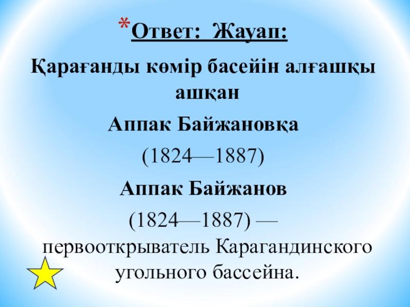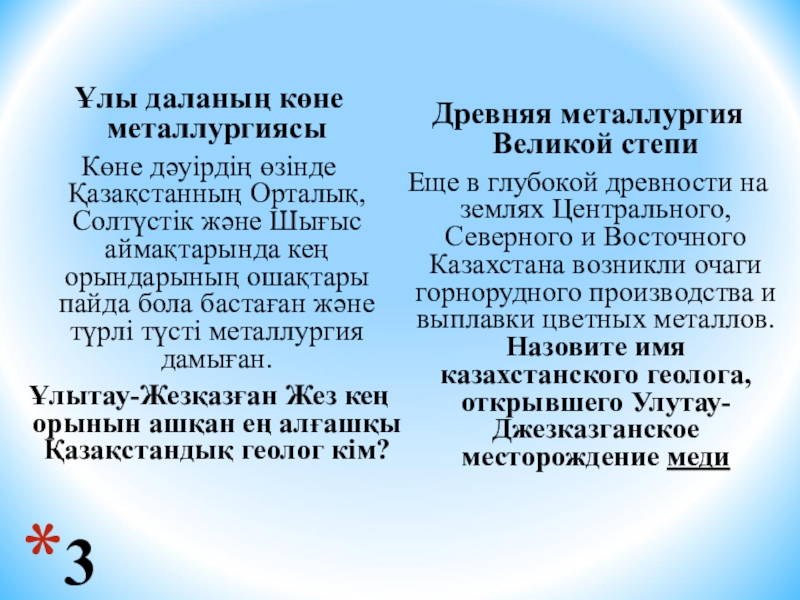 Еще в глубокой древности на землях Центрального, Северного и Восточного Казахстана возникли очаги горнорудного производства и выплавки цветных металлов. Назовите имя казахстанского геолога, открывшего Улутау-Джезказганское месторождение меди