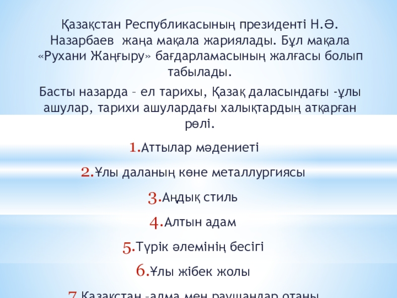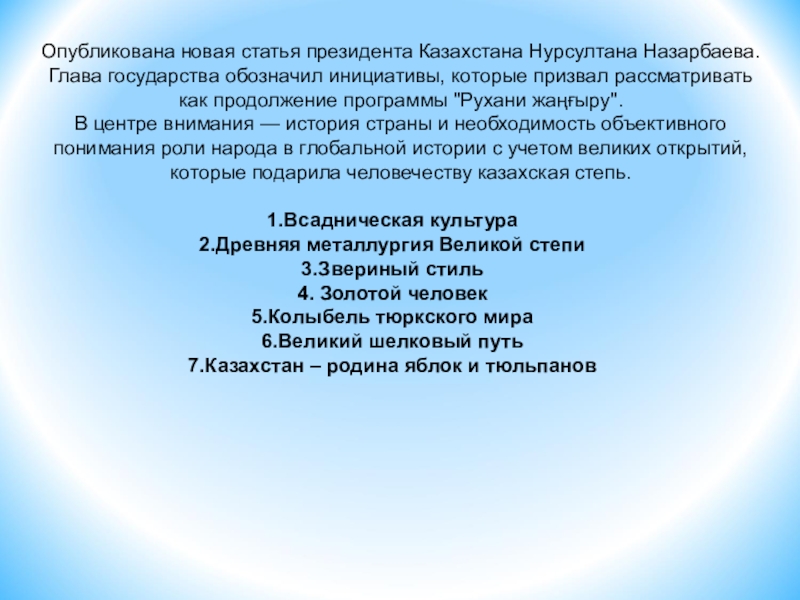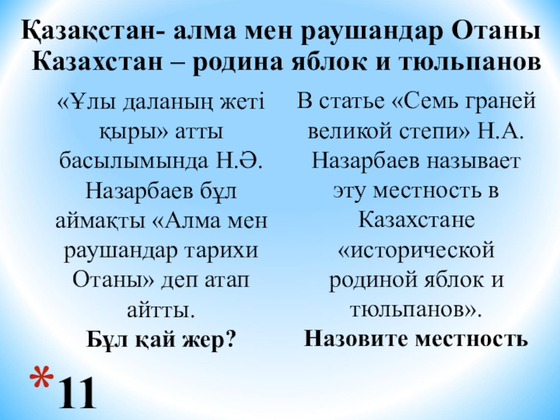 «Ұлы даланың жеті қыры» атты басылымында Н.Ә.Назарбаев бұл аймақты «Алма мен раушандар тарихи Отаны» деп атап айтты.