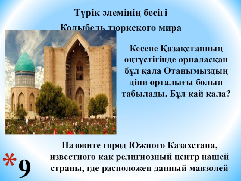 Кесене Қазақстанның оңтүстігінде орналасқан бұл қала Отанымыздың діни орталығы болып табылады. Бұл қай қала?