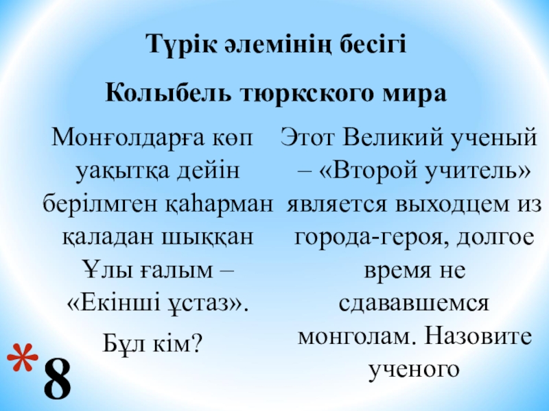 Этот Великий ученый – «Второй учитель» является выходцем из города-героя, долгое время не сдававшемся монголам. Назовите ученого