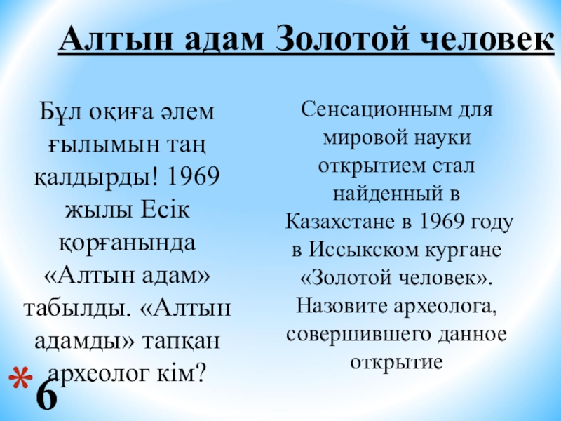 Сенсационным для мировой науки открытием стал найденный в Казахстане в 1969 году в Иссыкском кургане «Золотой человек». Назовите археолога, совершившего данное открытие