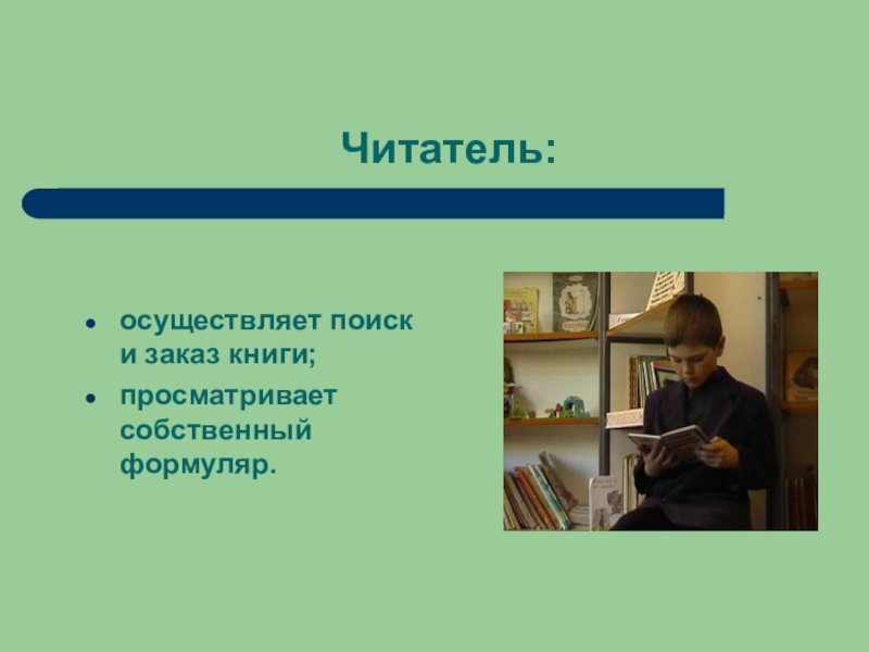 Читатель:осуществляет поиск и заказ книги;просматривает собственный формуляр.
