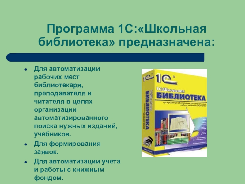 Программа 1С:«Школьная библиотека» предназначена:Для автоматизации рабочих мест библиотекаря, преподавателя и читателя в целях организации автоматизированного поиска нужных изданий, учебников.Для формирования заявок.Для автоматизации учета и работы с книжным фондом.