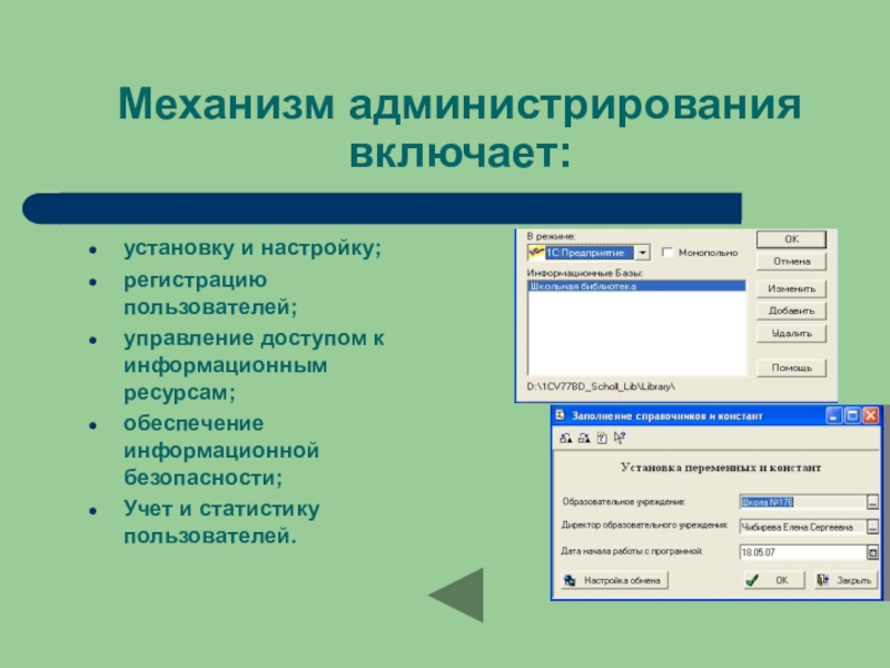 Механизм администрирования включает:установку и настройку;регистрацию пользователей;управление доступом к информационным ресурсам;обеспечение информационной безопасности;Учет и статистику пользователей.