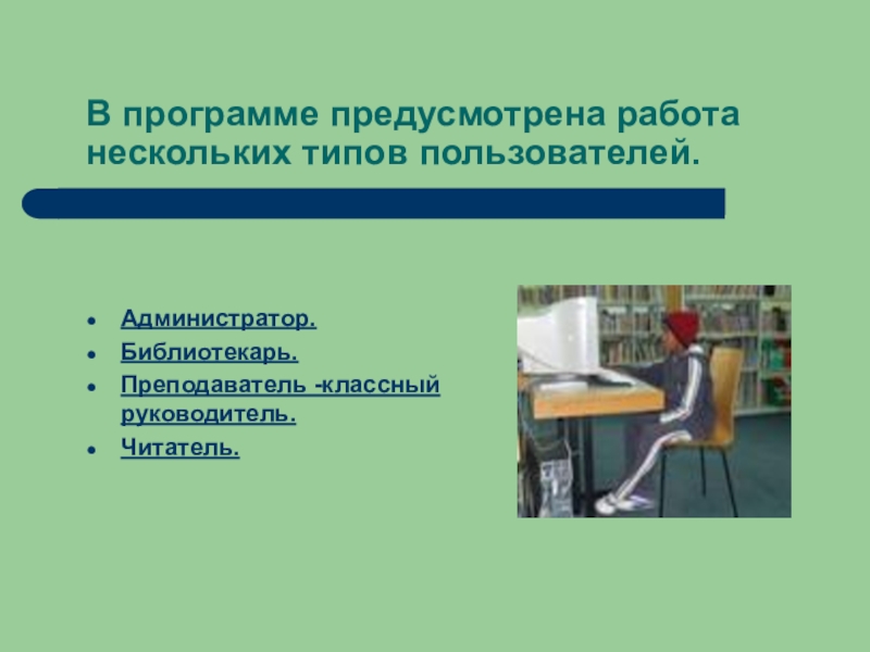 В программе предусмотрена работа нескольких типов пользователей.Администратор.Библиотекарь.Преподаватель -классный руководитель.Читатель.