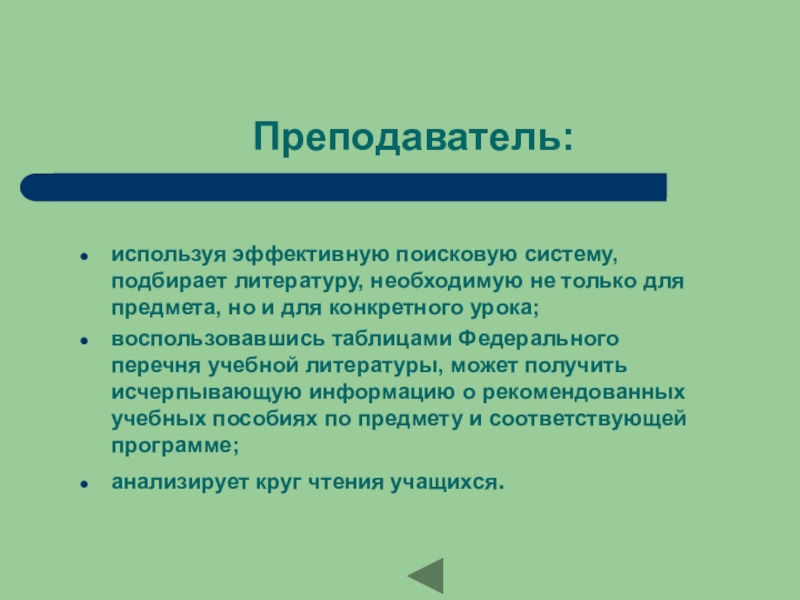 Преподаватель:используя эффективную поисковую систему, подбирает литературу, необходимую не только для предмета, но и для конкретного урока;воспользовавшись таблицами