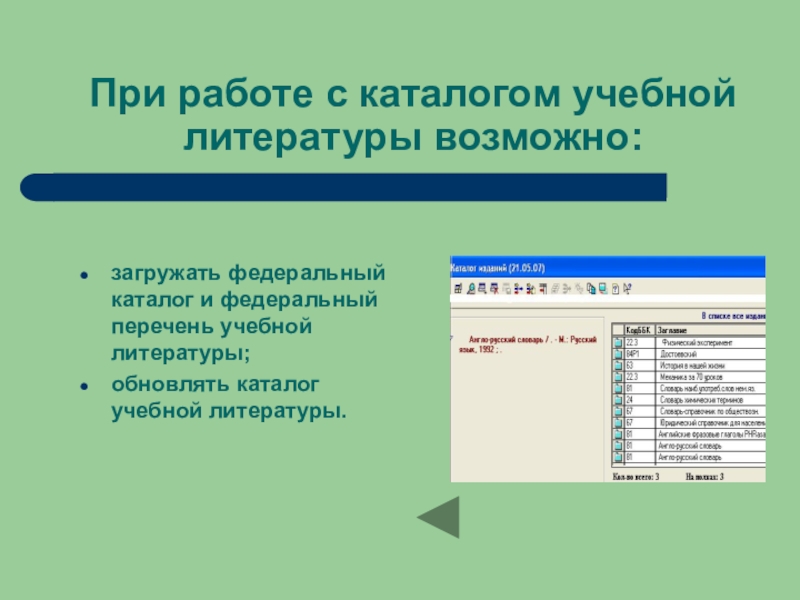 Слайд 8При работе с каталогом учебной литературы возможно: