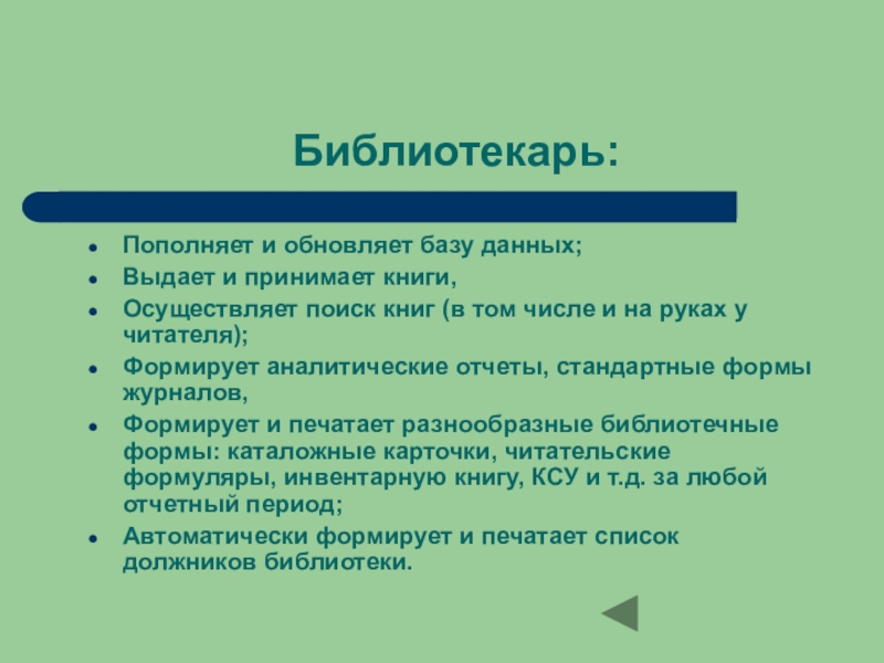 Библиотекарь:Пополняет и обновляет базу данных;Выдает и принимает книги,Осуществляет поиск книг (в том числе и на руках у