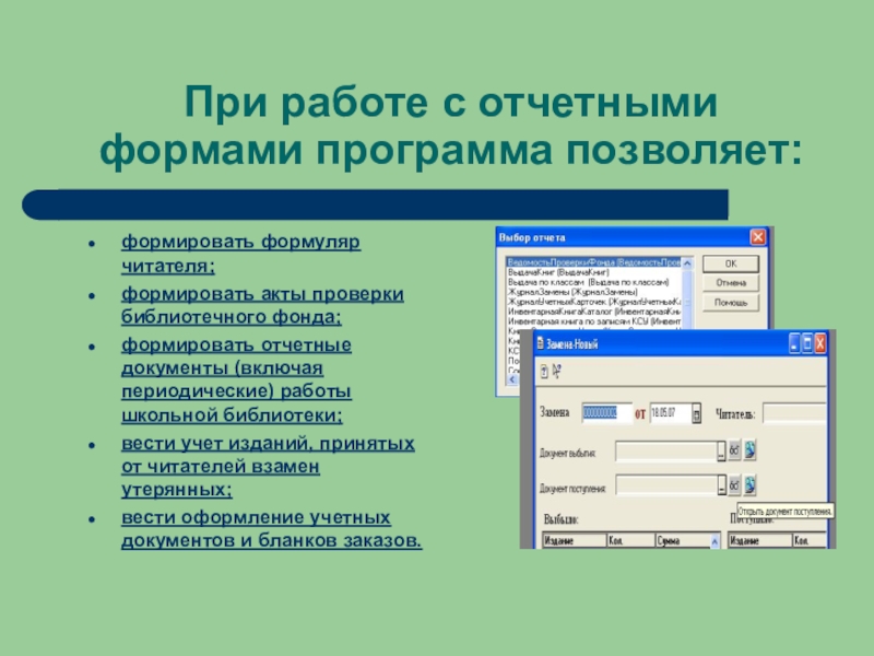 При работе с отчетными формами программа позволяет:формировать формуляр читателя;формировать акты проверки библиотечного фонда;формировать отчетные документы (включая периодические)