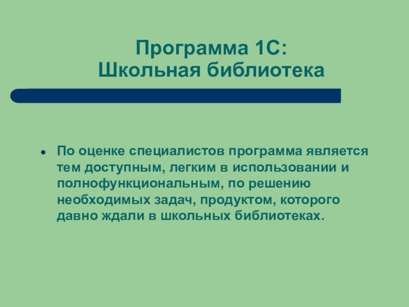 Программа 1С: Школьная библиотекаПо оценке специалистов программа является тем доступным, легким в использовании и полнофункциональным, по решению