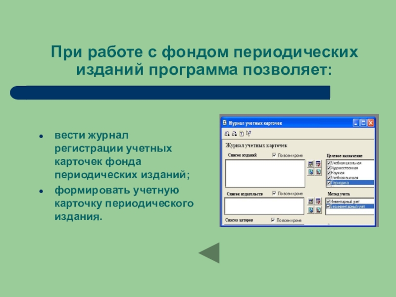 При работе с фондом периодических изданий программа позволяет:вести журнал регистрации учетных карточек фонда периодических изданий;формировать учетную карточку