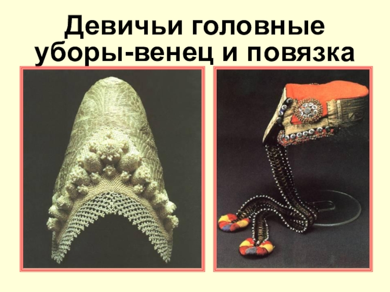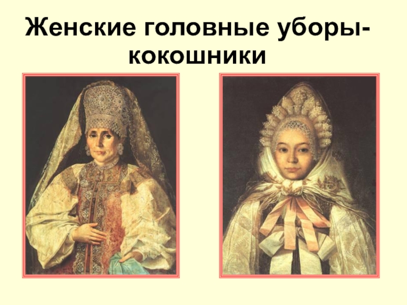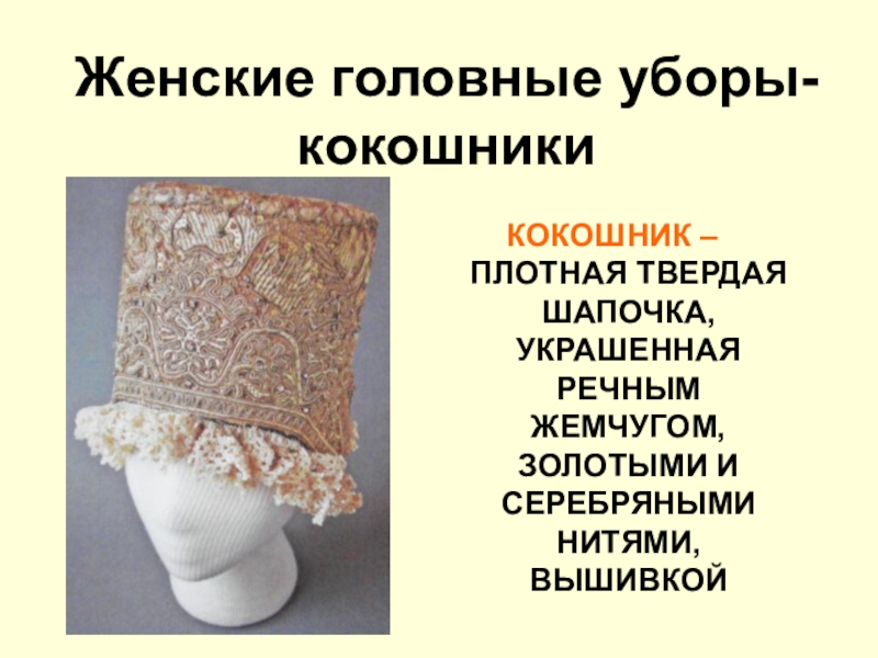 Женские головные уборы- кокошники КОКОШНИК – ПЛОТНАЯ ТВЕРДАЯ ШАПОЧКА, УКРАШЕННАЯ РЕЧНЫМ ЖЕМЧУГОМ, ЗОЛОТЫМИ И СЕРЕБРЯНЫМИ НИТЯМИ, ВЫШИВКОЙ