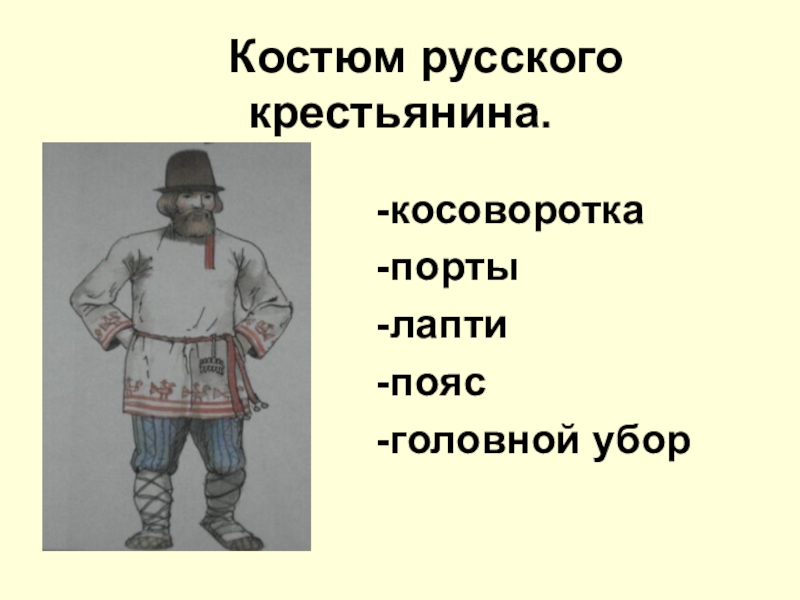 Костюм русского крестьянина.-косоворотка-порты-лапти-пояс-головной убор