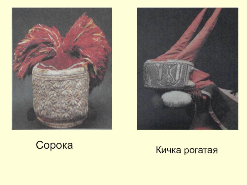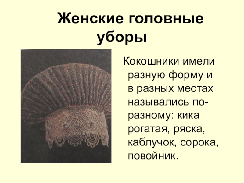Женские головные уборы Кокошники имели разную форму и в разных местах назывались по-разному: кика рогатая,