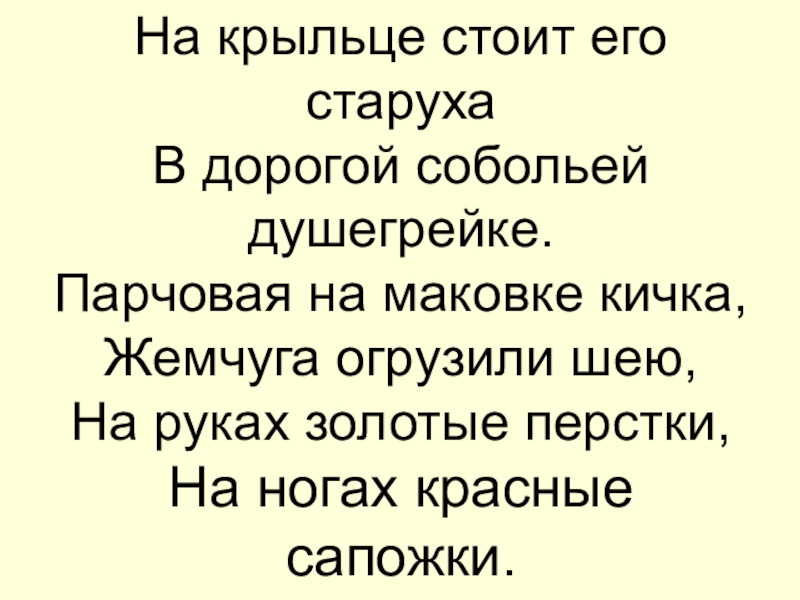 Слайд 4На крыльце стоит его старуха В дорогой собольей душегрейке. Парчовая на маковке кичка, Жемчуга