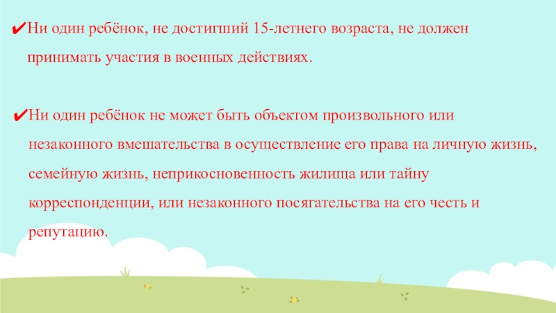 Ни один ребёнок не может быть объектом произвольного или незаконного вмешательства в осуществление его права на личную жизнь, семейную жизнь, неприкосновенность жилища или тайну корреспонденции, или незаконного посягательства на его честь и репутацию.
