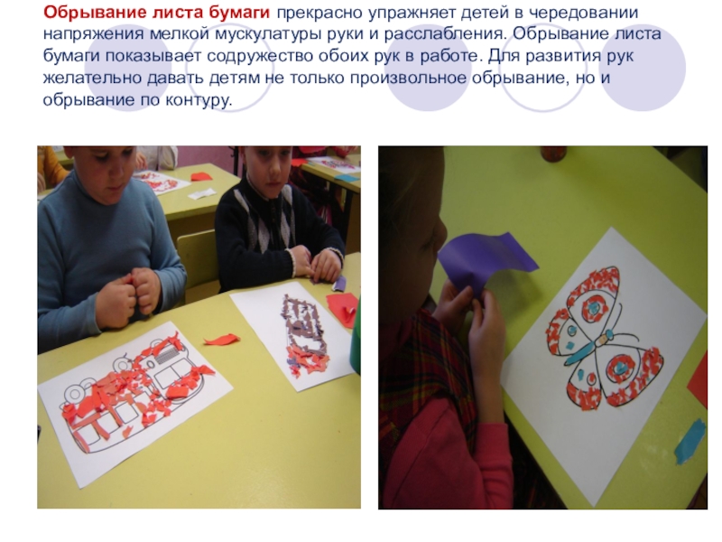 руки и расслабления. Обрывание листа бумаги показывает содружество обоих рук в работе. Для развития рук желательно давать детям не только произвольное обрывание, но и обрывание по контуру.