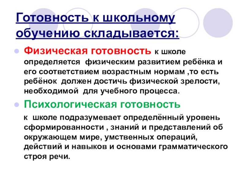 ребёнка и его соответствием возрастным нормам ,то есть ребёнок должен достичь физической зрелости, необходимой для учебного процесса.