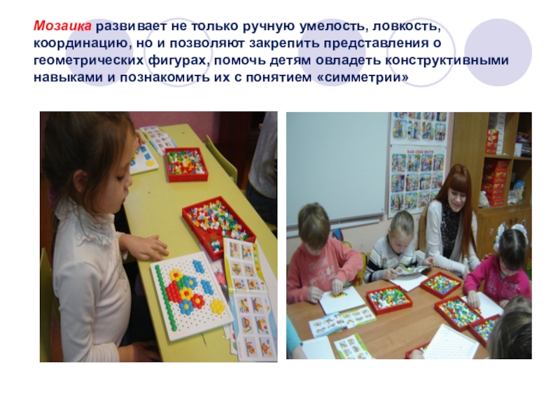 Мозаика развивает не только ручную умелость, ловкость, координацию, но и позволяют