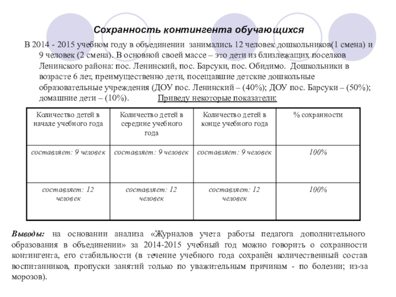 Выводы: на основании анализа «Журналов учета работы педагога дополнительного образования в объединении» за 2014-2015 учебный год можно говорить о сохранности контингента, его стабильности (в течение учебного года сохранён количественный состав воспитанников, пропуски занятий только по уважительным причинам - по болезни; из-за морозов).