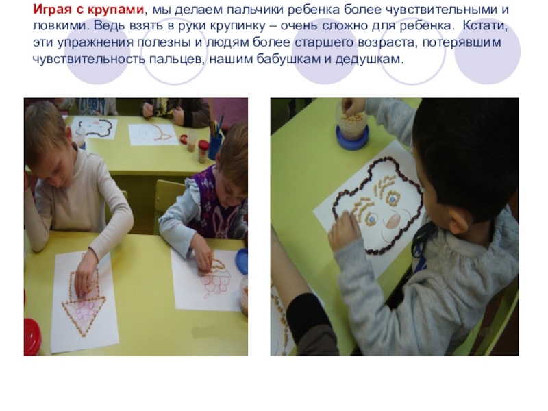 Слайд 23Играя с крупами, мы делаем пальчики ребенка более чувствительными и ловкими.