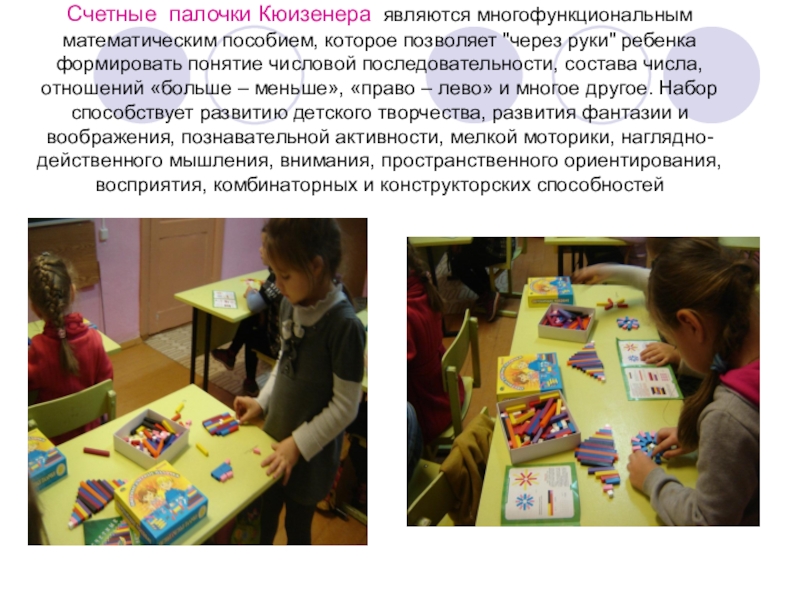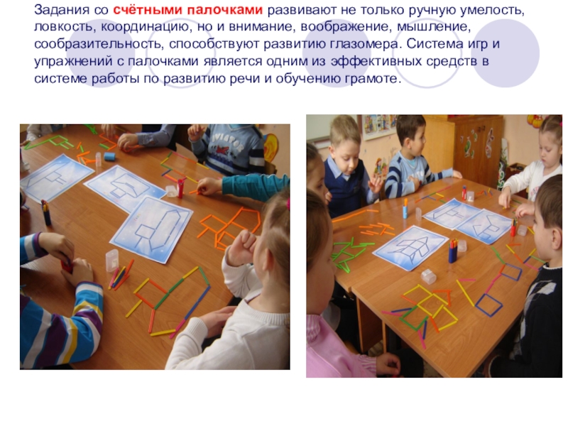 но и внимание, воображение, мышление, сообразительность, способствуют развитию глазомера. Система игр и упражнений с палочками является одним из эффективных средств в системе работы по развитию речи и обучению грамоте.